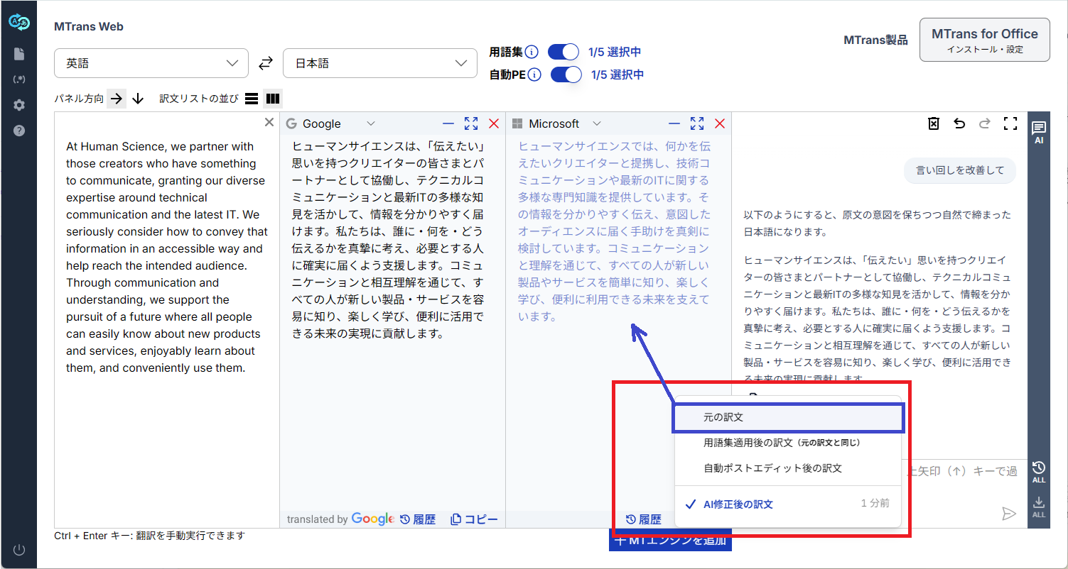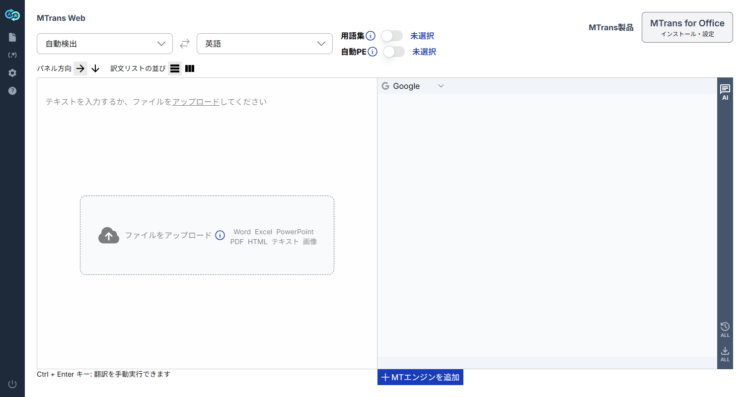 Google、Microsoft、OpenAIを利用できます。お申し込み内容に応じて、一部MTエンジンの利用が制限される場合があります。