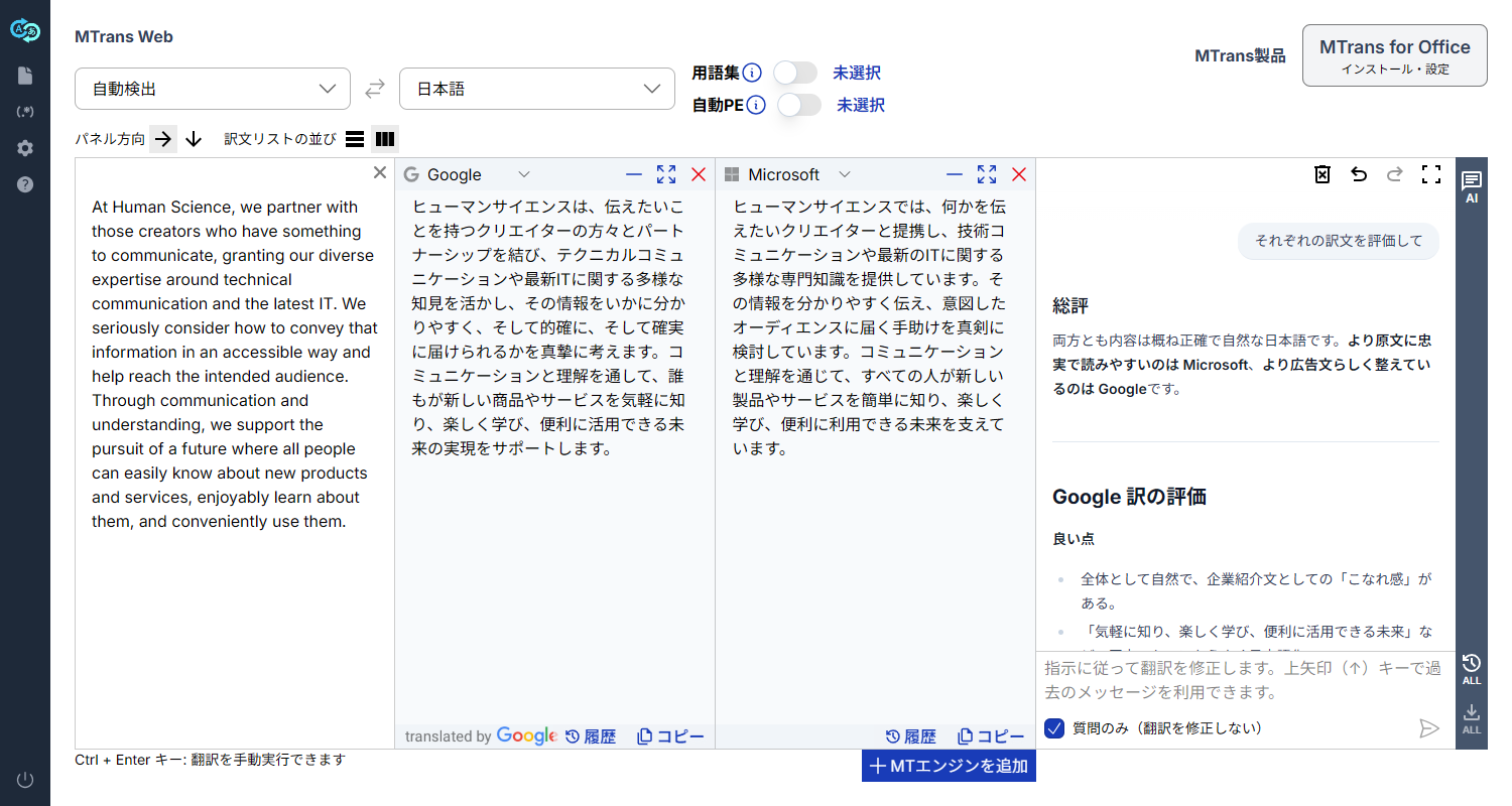 AIアシスタント機能では、翻訳結果に関するフィードバックを得ることができます。また、複数のMTエンジンで翻訳した場合、「それぞれの訳文を評価して」といった指示を出すことで、比較評価することもできます。